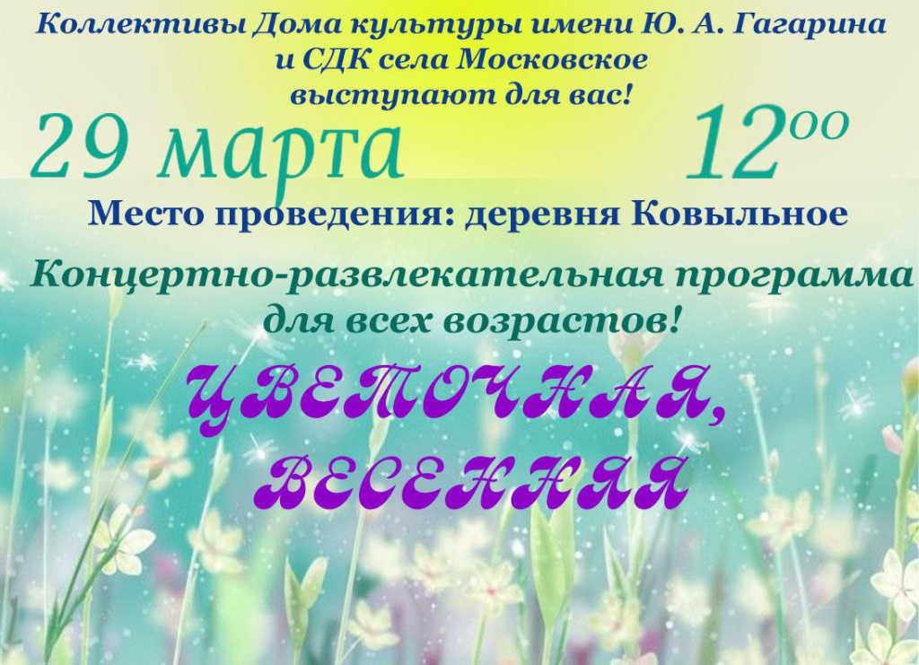 29 марта вас ждет отличная концертно-развлекательная программа для вашего настроения, которую вам подарят коллективы ДК им. Ю. А. Гагарина и с. Московское!