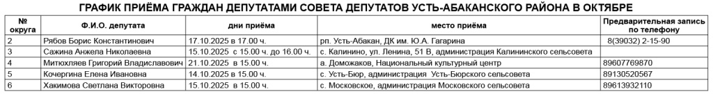 3 Сажина Анжела Николаевна 15.10.2025 с 15.00 ч. до 16.00 ч. с. Калинино, ул. Ленина, 51 В, администрация Калининского сельсовета
