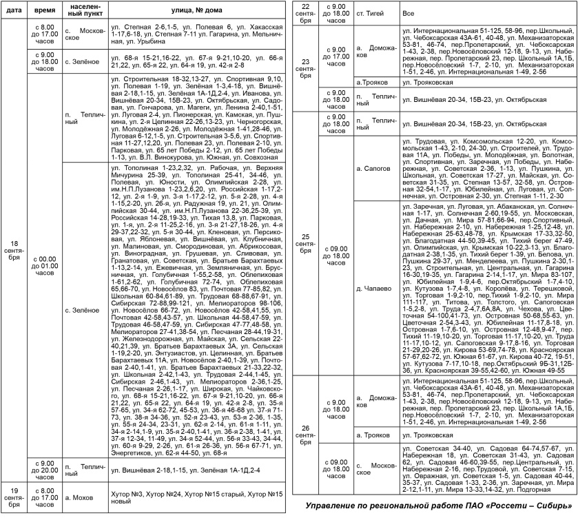 18 сентября с 8.00 до 17.00 часов с. Московское ул. Степная 2-6,1-5, ул. Полевая 6, ул. Хакасская 1-17,6-18, ул. Степная 7-11 ул. Гагарина, ул. Мельничная, ул. Урыбина
