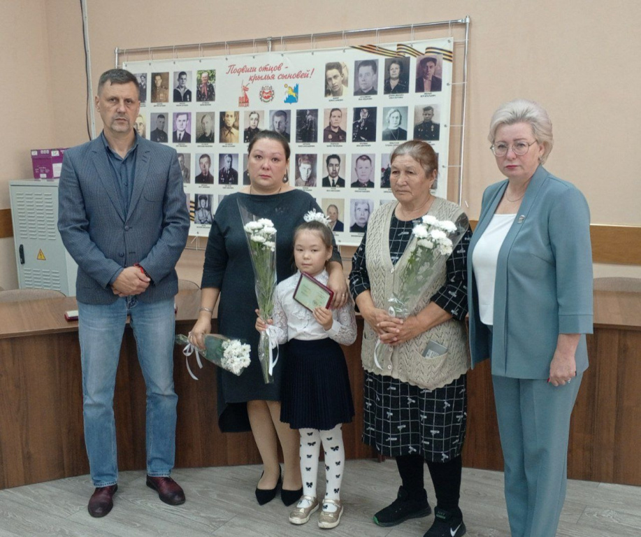 Два Ордена Мужества, медаль «За отвагу» и «Медаль Суворова» Глава Усть-Абаканского района Елена Егорова вручила родным и близким Руфима Казагашева, Василия Кожевникова, Дмитрия Чистанова и Юрия Камаева…