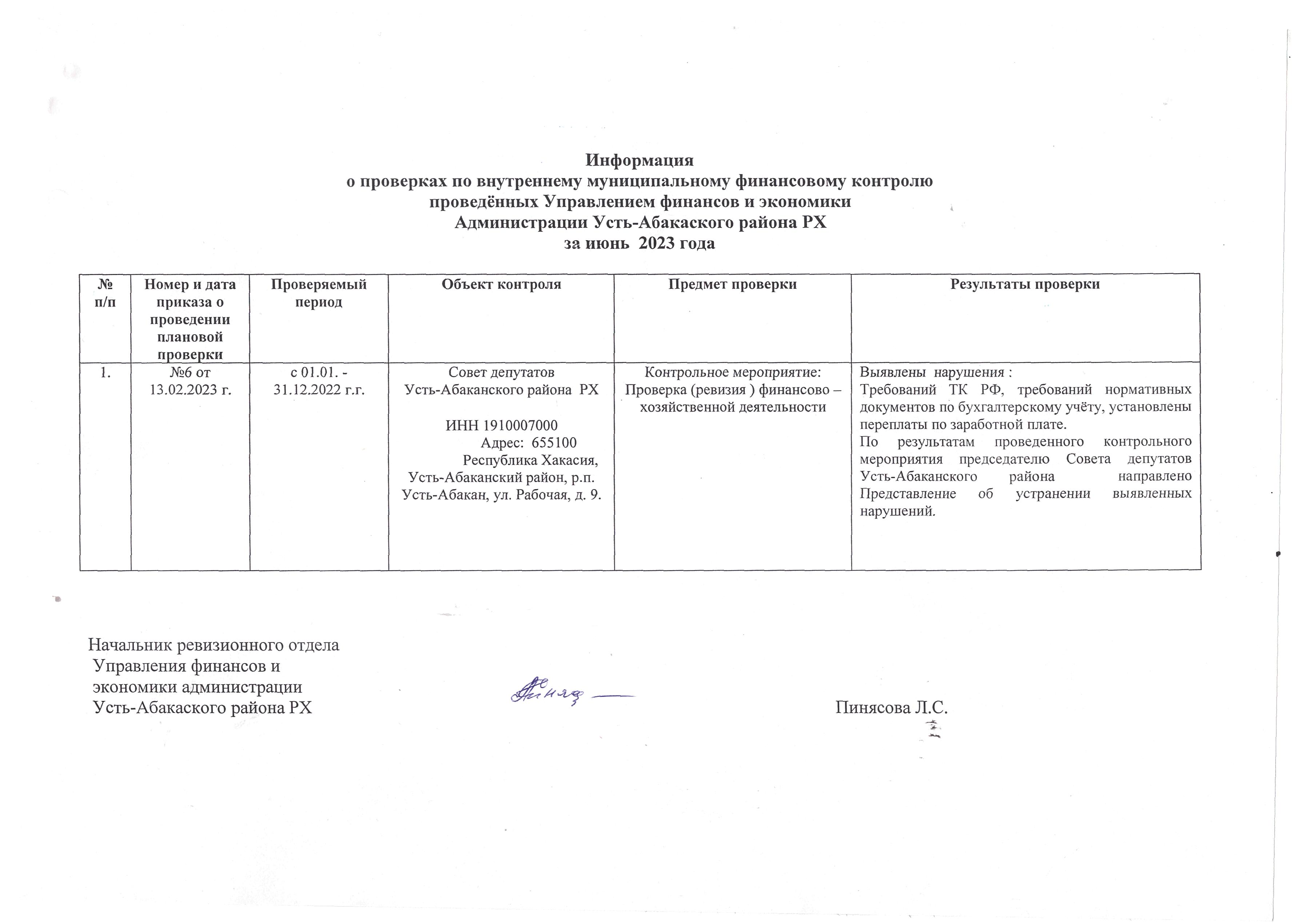 Информация о проверках по финансовому контролю, проведённых Управлением финансов и экономики администрации Усть-Абаканского района Республики Хакасия за февраль 2019 года