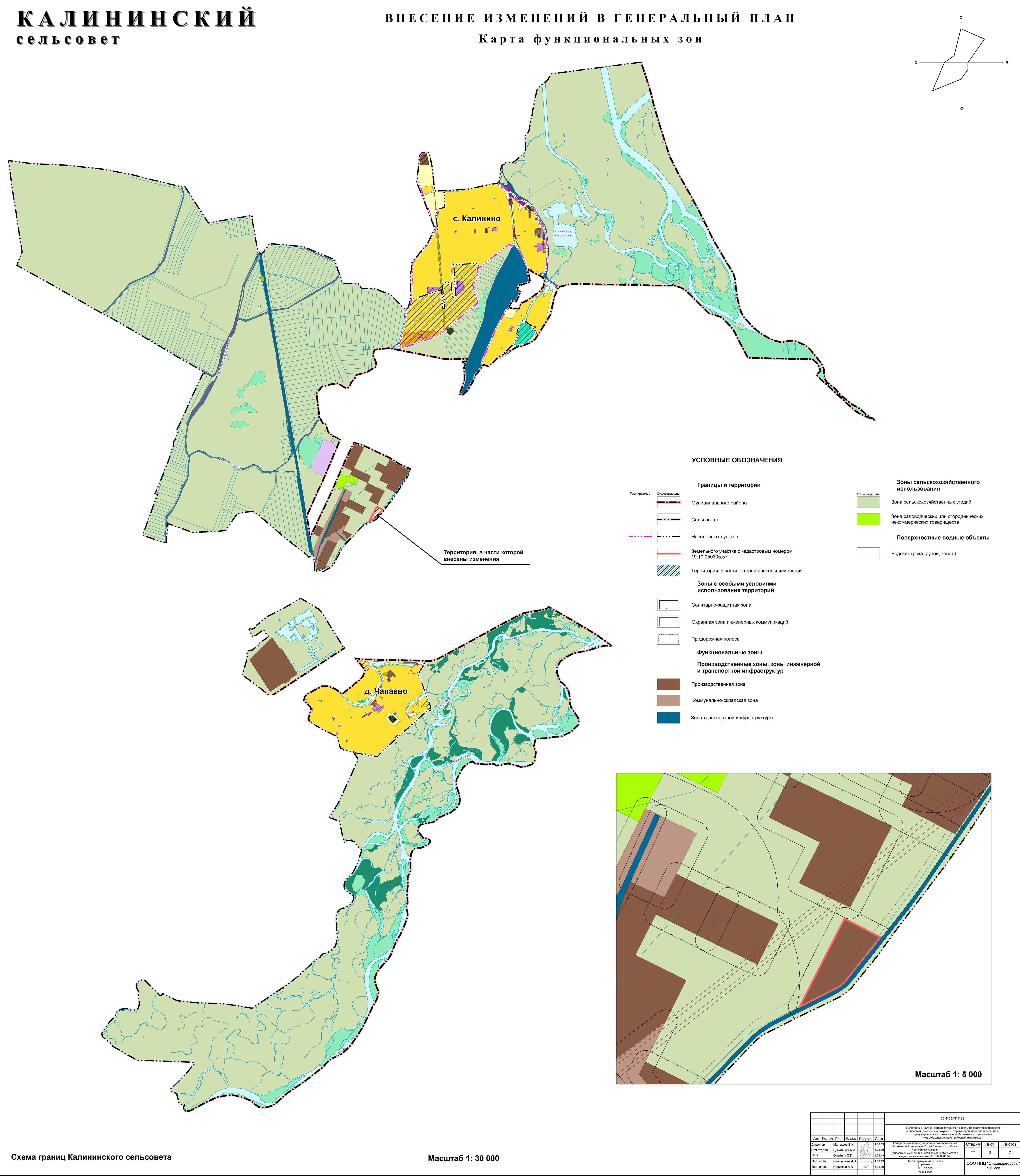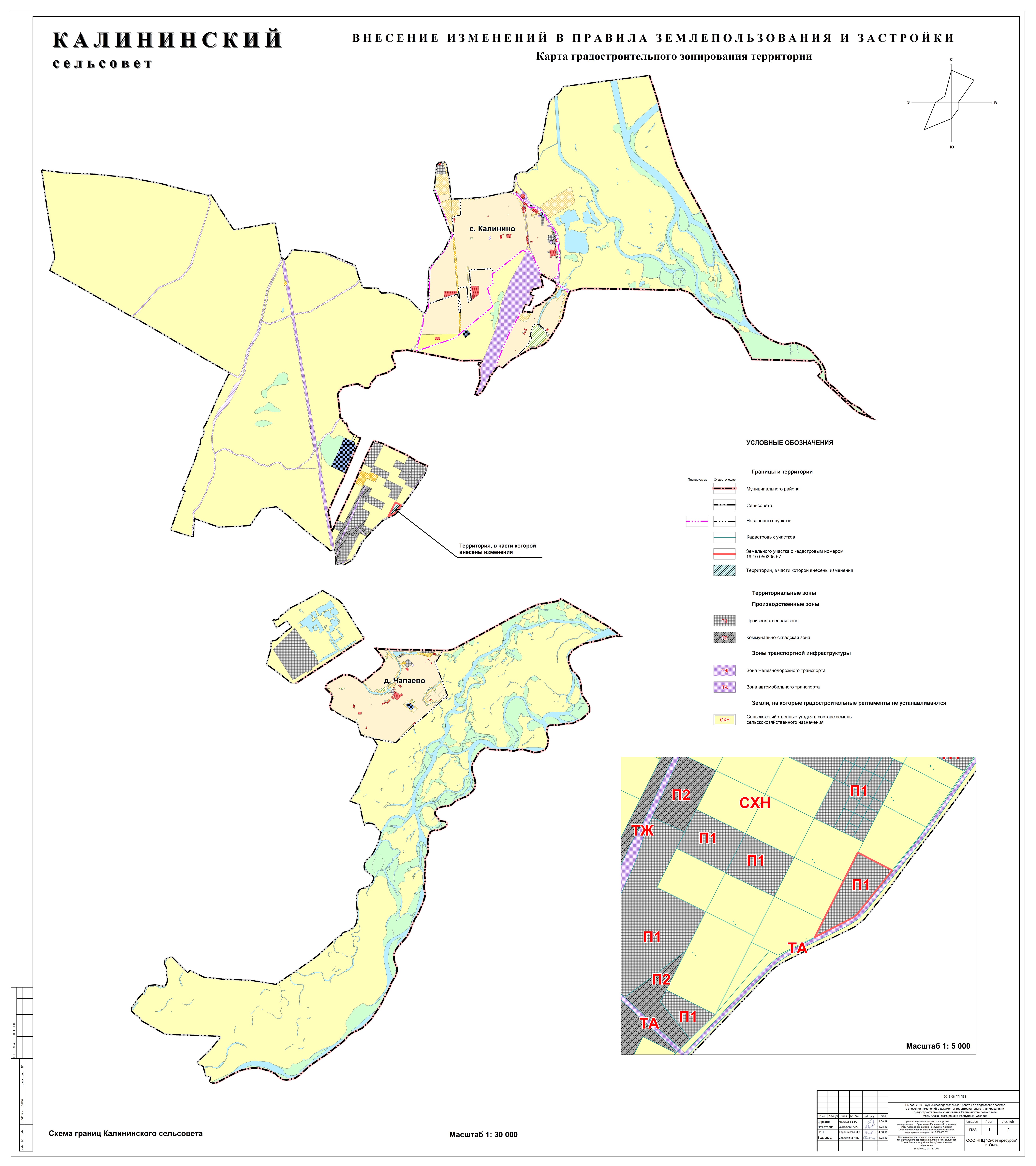 Проект о внесении изменений в Генеральный план и Правила землепользования и застройки Калининского сельсовета Усть-Абаканского района был разработан ООО НПЦ «Сибземресурсы» (г. Омск), в соответствии с постановлением администрации Усть-Абаканского района от 30.08.2019 № 1095-п «О подготовке проектов о внесении изменений в Генеральный план и Правила землепользования и застройки Калининского сельсовета Усть-Абаканского района Республики Хакасия».