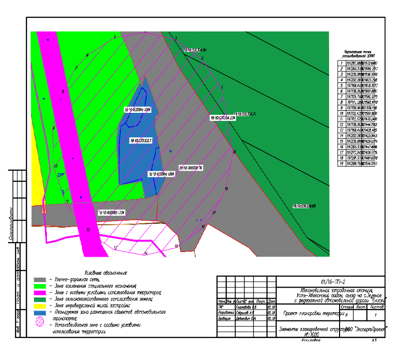 Проект планировки территории и проект межевания территории, расположенной в границах территориальной зоны «А.Т. – Зона автомобильного транспорта» Расцветовского сельсовета Усть-Абаканского района, ограниченной земельным участком с кадастровым номером 19:10:000000:1734, расположенным по адресу: Республика Хакасия, р-н Усть-Абаканский, п Расцвет, подъезд к с Зеленое и земельным участком с кадастровым номером 19:10:000000:76, расположенным по адресу: Республика Хакасия, Усть-Абаканский район, участок федеральной автодороги М-54 "Енисей" от Красноярска через Абакан, Кызыл до границы с Монголией, входящий в границы муниципального образования Усть-Абаканский район, км 399+050 - км 406+350 «О подготовке проекта планировки территории и проекта межевания территории» подготовлен правообладателем земельного массива самостоятельно на основании постановлений администрации Усть-Абаканского района от 16.08.2018 № 1031-п «О подготовке проекта планировки территории и проекта межевания территории, расположенной в границах земельных участков с кадастровыми номерами 19:10:030304:1099 и 19:10:030302:1, расположенных по адресу: Российская Федерация, Республика Хакасия, Усть-Абаканский район, развилка дорог «Енисей» -с. Зеленое»,