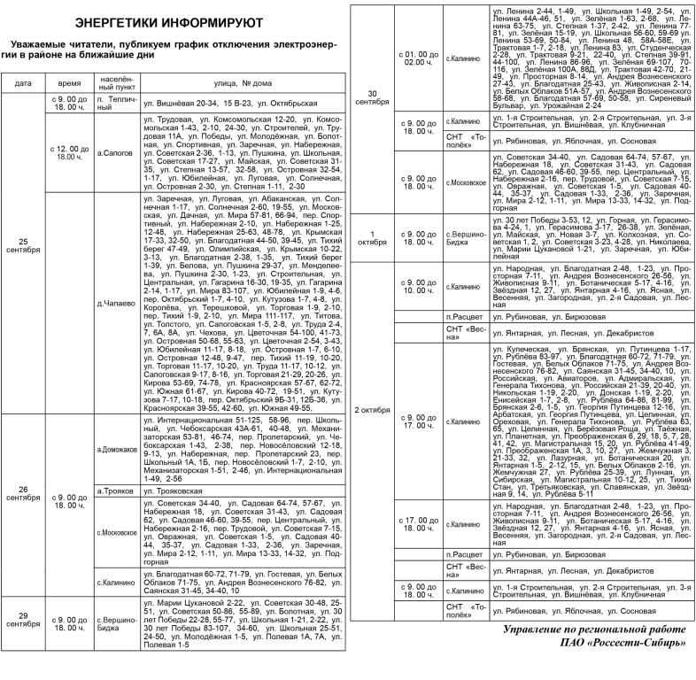 с 9. 00 до 17. 00 ч. с.Калинино ул. Купеческая, ул. Брянская, ул. Путинцева 1-17, ул. Рублёва 83-97, ул. Благодатная 60-72, 71-79, ул. Гостевая, ул. Белых Облаков 71-75, ул. Андрея Вознесенского 76-82, ул. Саянская 31-45, 34-40, 10, ул. Российская, ул. Авиаторов, ул. Адмиральская, ул. Генерала Тихонова, ул. Российская 21-39, 20-40, ул. Никольская 1-19, 2-20, ул. Донская 1-19, 2-20, ул. Енисейская 1-7, 2-8, ул. Рублёва 64-86, 81-99, ул. Брянская 2-6, 1-5, ул. Георгия Путинцева 12-16, ул. Арбатская, ул. Георгия Путинцева, ул. Целинная, ул. Ореховая, ул. Генерала Тихонова, ул. Рублёва 63, 65, ул. Целинная, ул. Берёзовая Роща, ул. Таёжная, ул. Планетная, ул. Преображенская 6, 29, 18, 5, 7, 28, 41, 42, ул. Магистральная 15, 20, ул. Рублёва 41-49, ул. Преображенская 1А, 3, 10, 27, ул. Жемчужная 3, 21-33, 32, ул. Лазурная, ул. Ботаническая 20, ул. Янтарная 1-5, 2-12, 15, ул. Белых Облаков 2-16, ул. Жемчужная 27, ул. Рублёва 25-39, ул. Лунная, ул. Сибирская, ул. Магистральная 10-12, 25, ул. Тихий Стан, ул. Третьяковская, ул. Славянская, ул. Звёздная 9, 14, ул. Рублёва 5-11