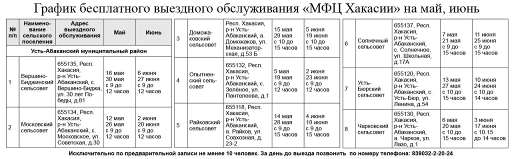 7 сельское поселение Усть-Бюрский сельсовет 655120, Респ. Хакасия, р-н Усть-Абаканский, с. Усть-Бюр, ул. Ленина, д.54 13 мая