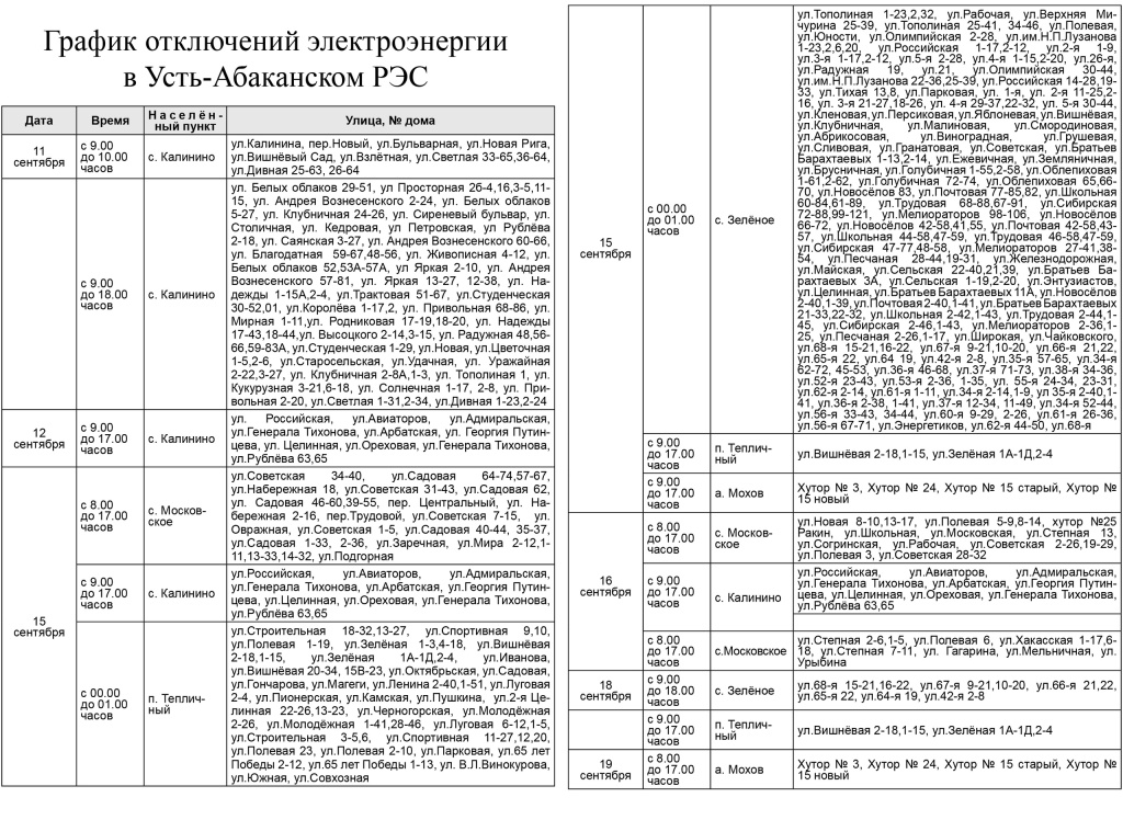 График отключений электроэнергии в Усть-Абаканском РЭС