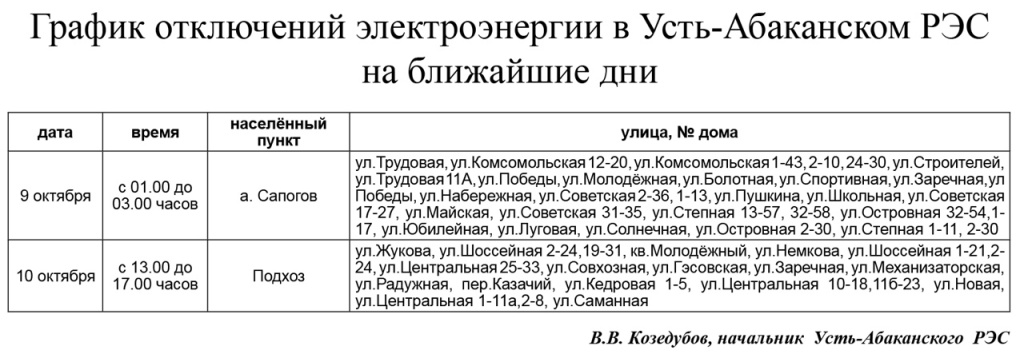 9 октября с 01.00 до 03.00 часов а. Сапогов ул.Трудовая, ул.Комсомольская 12-20, ул.Комсомольская 1-43, 2-10, 24-30, ул.Строителей, ул.Трудовая 11А, ул.Победы, ул.Молодёжная, ул.Болотная, ул.Спортивная, ул.Заречная,ул Победы, ул.Набережная, ул.Советская 2-36, 1-13, ул.Пушкина, ул.Школьная, ул.Советская 17-27, ул.Майская, ул.Советская 31-35, ул.Степная 13-57, 32-58, ул.Островная 32-54,1-17, ул.Юбилейная, ул.Луговая, ул.Солнечная, ул.Островная 2-30, ул.Степная 1-11, 2-30