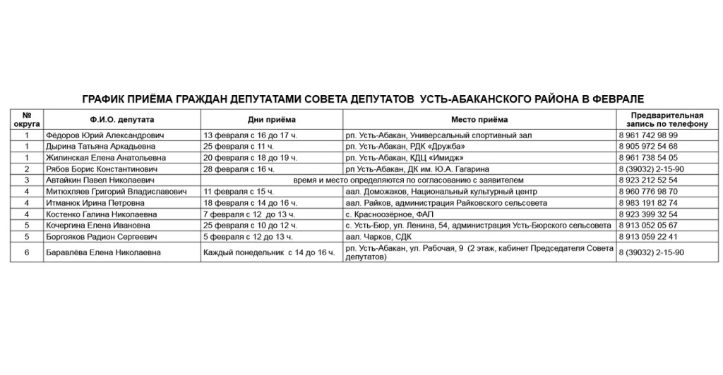 6 Баравлёва Елена Николаевна Каждый понедельник с 14 до 16 ч. рп. Усть-Абакан, ул. Рабочая, 9 (2 этаж, кабинет Председателя Совета депутатов) 8 (39032) 2-15-90