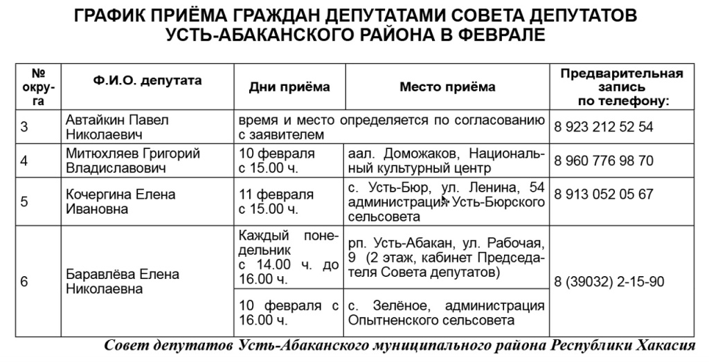 6 Баравлёва Елена Николаевна Каждый понедельник с 14.00 ч. до 16.00 ч. рп. Усть-Абакан, ул. Рабочая, 9 (2 этаж, кабинет Председателя Совета депутатов) 8 (39032) 2-15-90 10 февраля с 16.00 ч. с. Зелёное, администрация Опытненского сельсовета