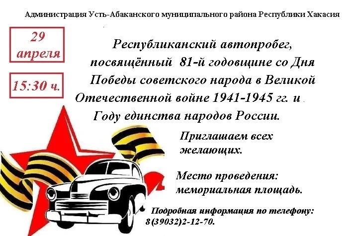 Уважаемые жители района. Приглашаем вас на республиканский автопробег, посвященный 81-годовщине со Дня Победы советского народа в Великой Отечественной войне 1941-1945 г. г. И Году единства народов России. Место проведения: Мемориальная площадь.