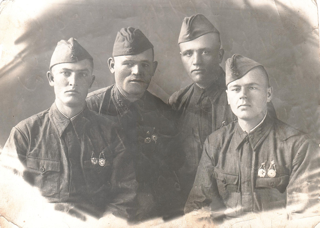 По рассказам старших, а мне уже самой 84-й год, знаю, что когда папу призывали на защиту Родины, его сначала отправили в Абакан, потом в Минусинск. Мама пешком ходила в Минусинск его провожать. Потом его направили в Красноярск. Сохранилась фотография, где он с друзьями (папа первый слева). На фронте он был тяжело ранен. Долго лежал в госпитале Витебска. Рана не заживала. И всякий раз, как вытаскивали из неё бинты, он падал в обморок.