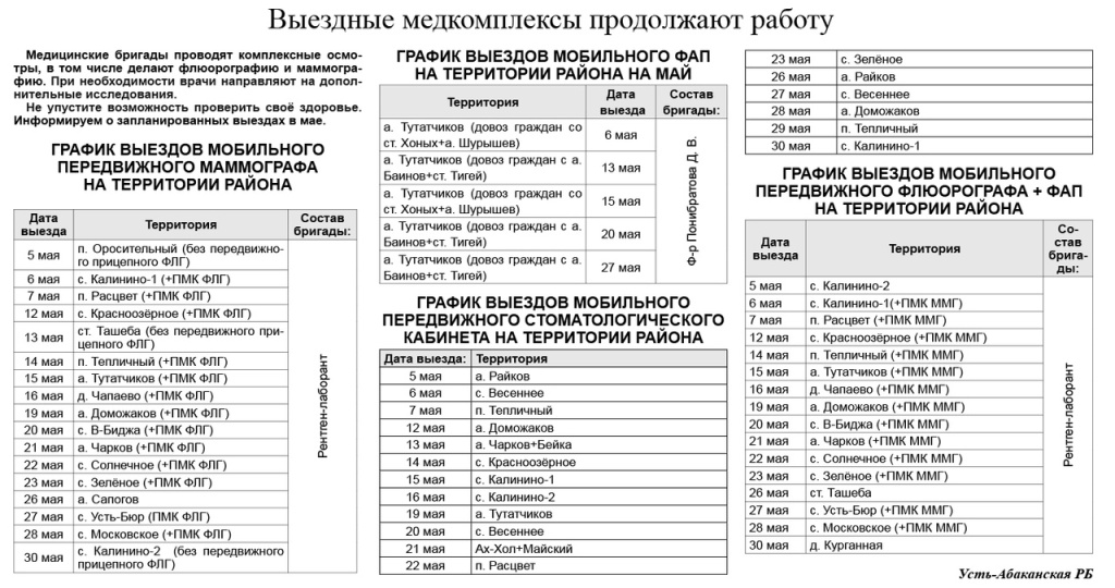 Не упустите возможность проверить своё здоровье. Информируем о запланированных выездах в мае.