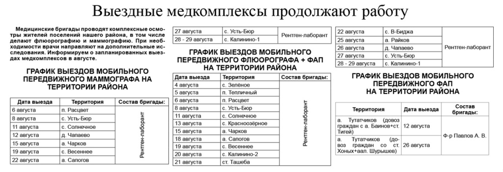 Медицинские бригады проводят комплексные осмотры жителей поселений нашего района, в том числе делают флюорографию и маммографию. При необходимости врачи направляют на дополнительные исследования. Информируем о запланированных выездах медкомплексов в августе.