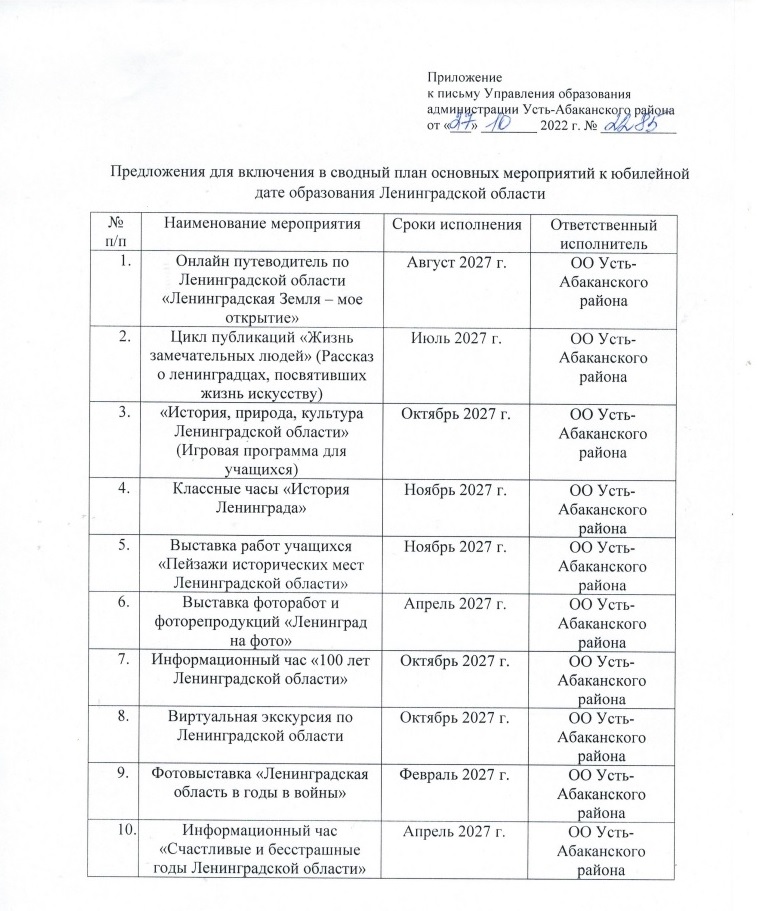 Во исполнение Указа Президента Российской Федерации от 08 августа 2022 года № 527 «О праздновании 100-летия образования Ленинградской области» в 2027 году Управление образования администрации Усть-Абаканского района разработали предложения в сводный план